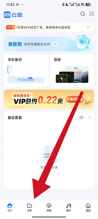 1、打开123云盘APP,在首页底部点击文件,进入文件页面。