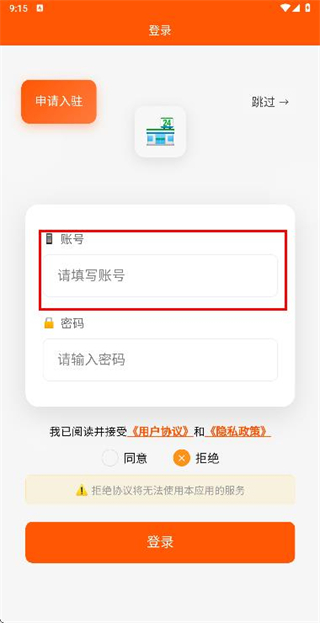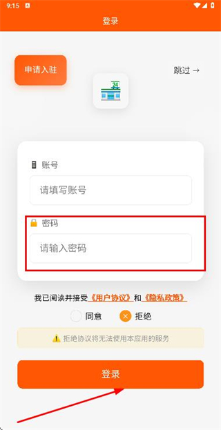 2、在登录页面填写账号后,点击同意接受协议政策。