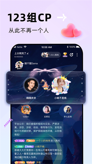 核心社交功能全部免费提供,无需额外付费即可解锁找cp、连麦互动等服务,无门槛享受多元社交体验,降低年轻用户社交成本,让更多人轻松参与社交互动。