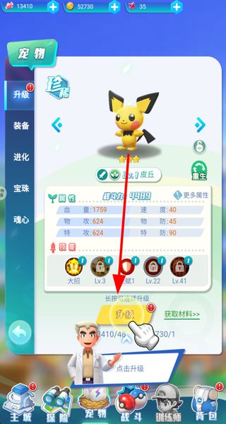 1、打开宠物界面点击升级按钮,提升宝可梦的等级,增强其属性与战斗力,助力后续战斗。