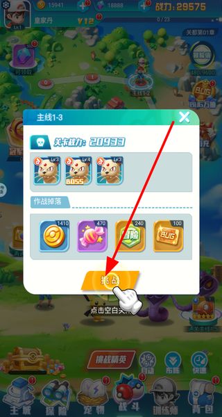 2、在游戏主线关卡界面查看关卡战力要求,点击挑战按钮进入关卡,与敌方宝可梦展开对战。