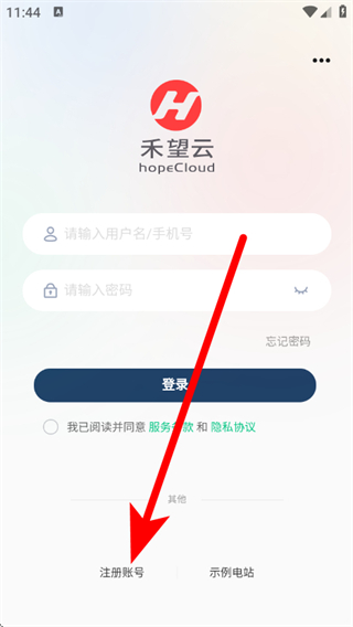 1、打开禾望云,在登录页面,点击注册账号。