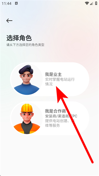 2、在选择角色页,点击我是业主,进入注册页面。