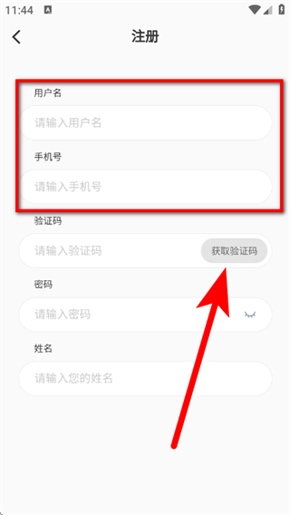 3、在注册页面,输入用户名与手机号,点击获取验证码。