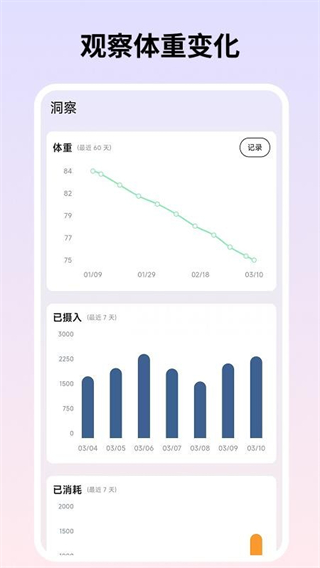 营养摄入数据与体重变化均以图表形式呈现,走势变化一目了然,方便用户快速解读数据,及时发现饮食与体重问题,针对性调整健康方案。