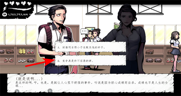 2、在对话选项界面,选择B竞争真是件不容易的事选项,这是回应角色对话的核心操作,选定后可继续推进剧情的交流流程。