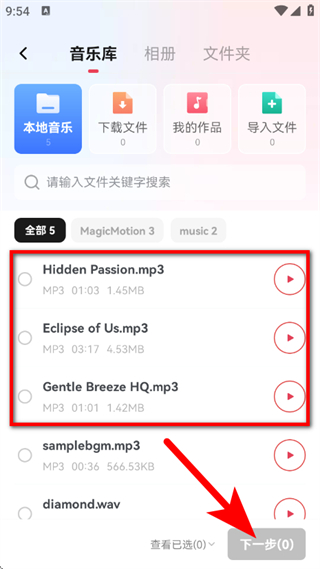 2、在音乐库页面,选择目标音频文件,点击下一步。