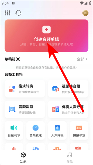 1、打开音频快剪,点击创建音频剪辑,进入音乐库页面。