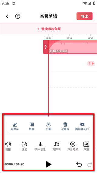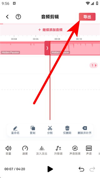 4、编辑完成后,点击右上角导出,保存剪辑后的音频。
