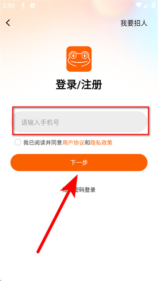 3、在登录注册页面的输入框中填写目标手机号,勾选协议后,点击下一步。