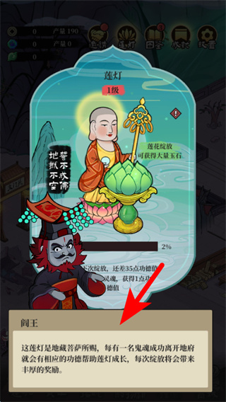2、在莲灯界面可了解:莲灯由地藏菩萨所赐,鬼魂离开地府会积累功德,莲灯绽放能得丰厚奖励。