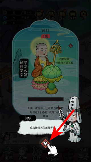 3、查看完莲灯说明后,点击界面下方的叉号按钮,关闭莲灯界面回到主场景。