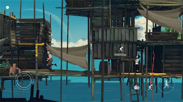 3、看到CROUCH提示后,点击底部的蹲下按钮,让角色切换为蹲下状态,通过当前区域以推进流程。