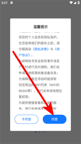 1、打开登虹云视频,在温馨提示弹窗中,点击同意。
