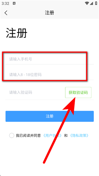 3、在注册页,输入手机号设置密码,点击获取验证码。