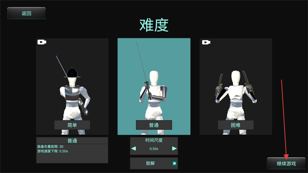 2、在难度选择界面,选定简单、普通或困难难度后,点击继续游戏按钮推进游戏进程。