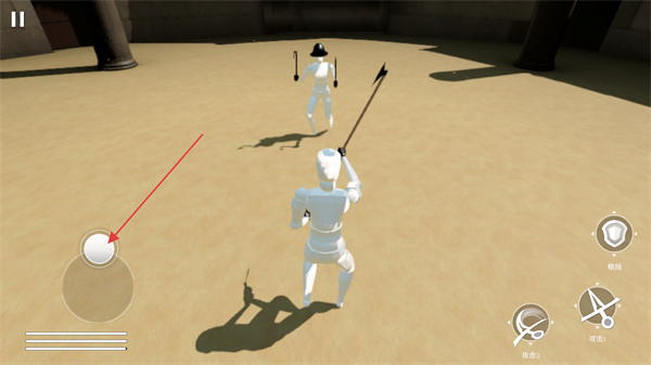 4、进入战斗界面后,通过格挡、攻击1、攻击2等按钮操控角色,与敌方单位进行对战。