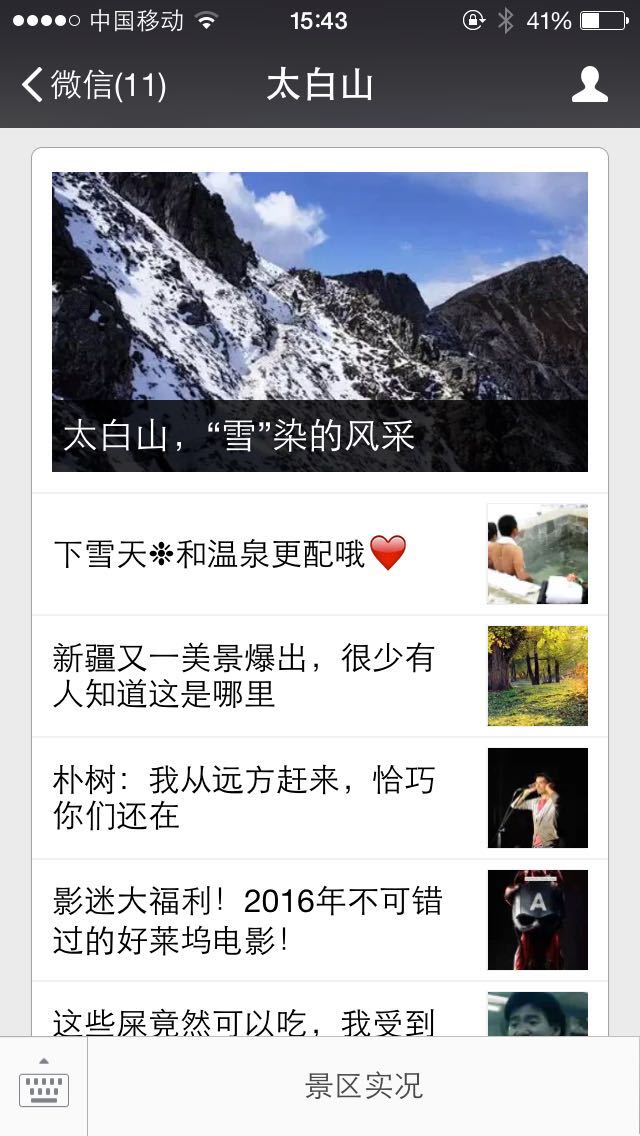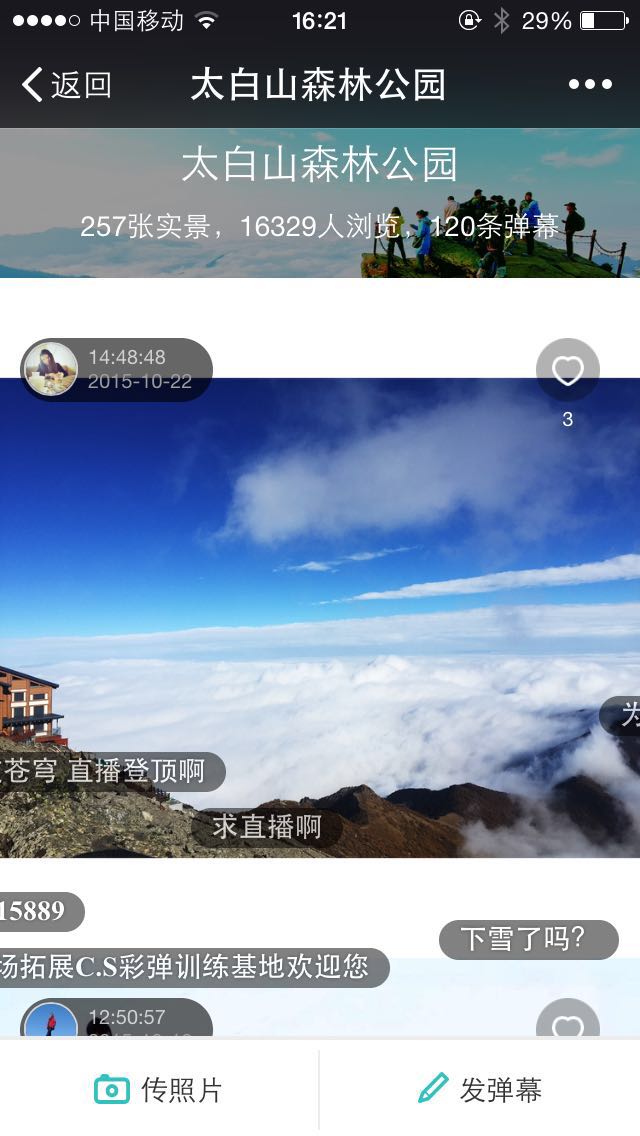 景区实况内测版发布,太白山景区率先接入景区微官网直接上传-分享景区实景图,通过有趣的实时弹幕参与互动,朋友圈不断传播,增加景区人气。