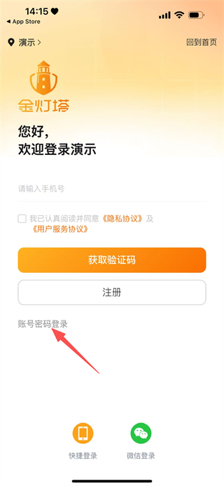 2、在登录页面,点击账号密码登录选项,切换至账号密码登录界面。