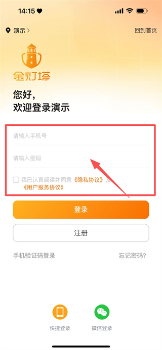 3、在账号密码登录界面,填写手机号和密码,点击登录完成账号登录。