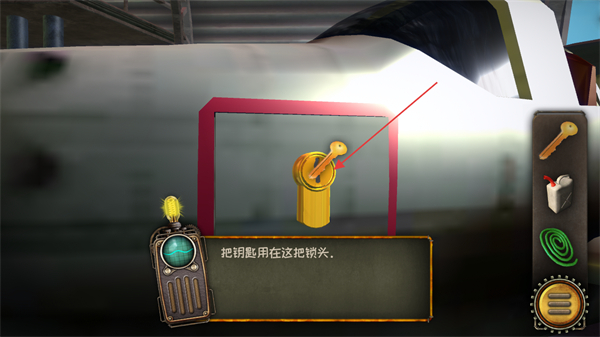 1、依据界面提示把钥匙用在这把锁头,将右侧道具栏内的钥匙,使用到当前界面的锁头处,完成该锁具的解锁步骤。