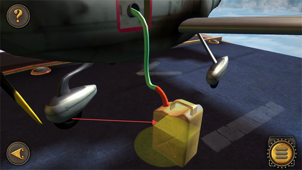 2、将油桶放置在飞机下方连接着的管线处收集机油,该道具是关卡流程中的交互元素,需确认其连接状态以推进后续操作。