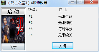 死亡鬼屋3四项修改器是游戏《死亡鬼屋3》的一款辅助工具,修改器为中文版,纯中文界面,更方便玩家使用,提供无限生命、无限弹药、无限续关、每局得分四项功能,赶快下载体验吧!