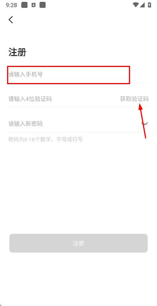 2、在注册账号页面填写手机号码后,点击获取验证码。