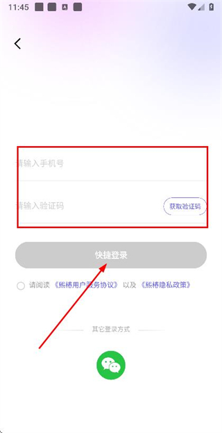 3、在登录页面填写手机号和验证码,勾选协议后,点击快捷登录完成账号登录操作。