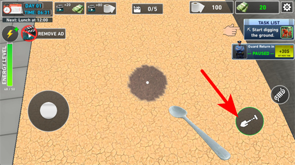 玩家被困在戒备森严的监狱中,狱警时刻巡逻监视,初始仅能依靠藏在床下的一把勺子展开行动。监狱内有固定布局的牢房设施与规律巡查的守卫,想要重获自由,必须利用有限资源挖掘地道,收集关键物品,躲避巡查,制定并执行周密的逃脱策略。