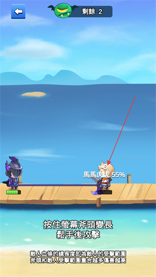 3、在战斗环节,按照提示长按角色进行攻击操作,尽量让斧頭与敌人站位重合来提高伤害。
