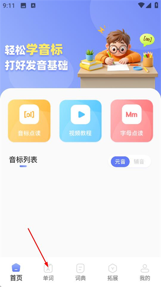 1、在英语标准国际音标首页,点击底部单词选项,进入单词页面。