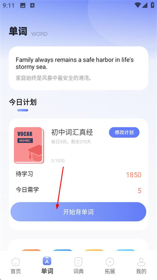 2、在单词页面,点击开始背单词按钮,进入背单词页面。