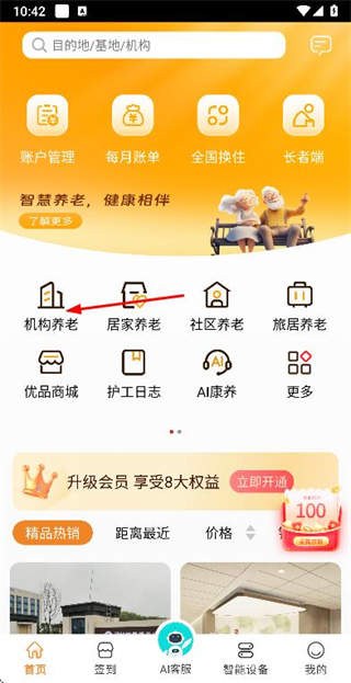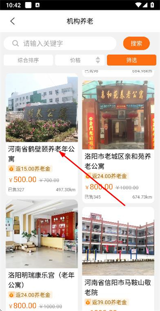 1、在首页点击机构养老选项,进入机构养老列表页面。