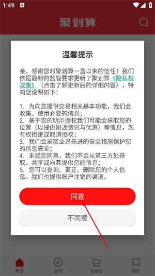 1、在聚划算的温馨提示弹窗中,点击同意,进入应用主界面。