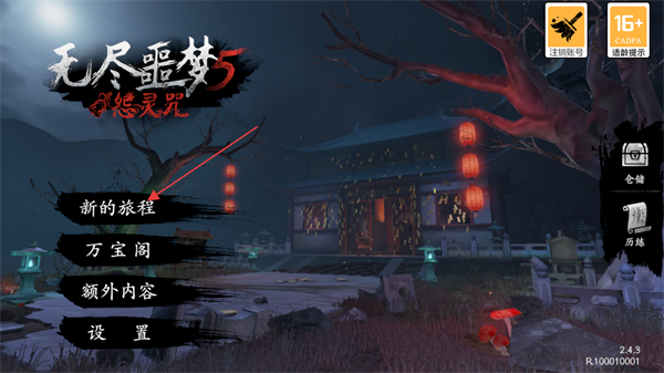 1、这是无尽噩梦6怨灵咒的主界面,包含新的旅程、万宝阁、额外内容、设置等选项,点击新的旅程可开启游戏的主线流程。