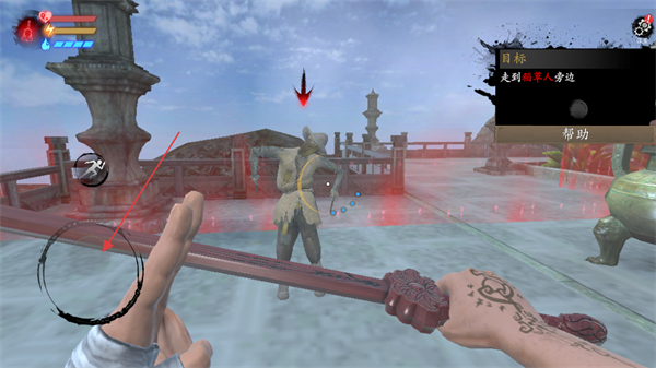 3、进入游戏场景后,界面显示目标为走到稻草人旁边,需通过左侧的移动操控区域控制角色移动,向场景中的稻草人位置行进以推进流程。