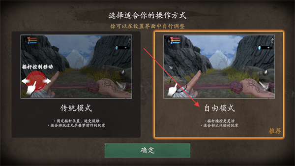 2、此为操作方式选择界面,提供传统模式和自由模式两种选项,其中自由模式为推荐选项,适配初次体验的玩家,选定后点击确定即可进入游戏。