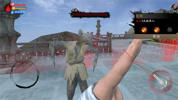 4、当前目标为攻击3次稻草人,需点击界面右侧的攻击按钮,对训练用草人执行攻击操作,完成3次攻击后即可达成该阶段目标。
