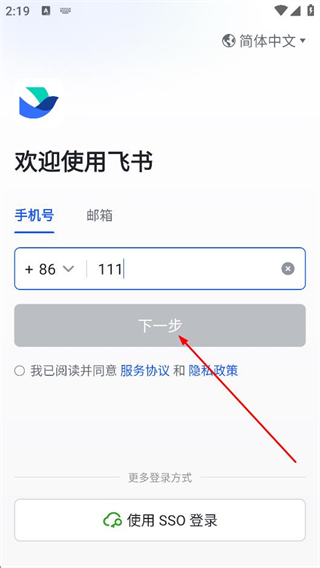 3、在输入密码页面,填写对应的账号密码,点击下一步,完成飞书账号登录。