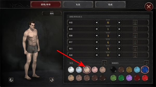 2、在角色创建界面,通过红色箭头对应的肤色选项,可选择你偏好的角色肤色,完成角色外观的基础自定义。