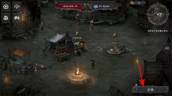 3、进入游戏场景后,靠近NPC时点击红色箭头指向的交谈按钮,可触发与NPC的对话,推进剧情或获取信息。