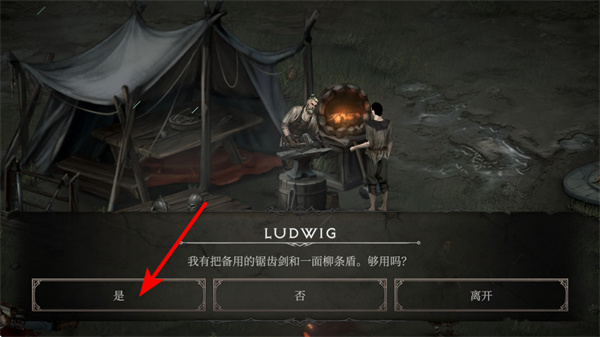 4、与NPC对话时,点击红色箭头对应的是选项,可接受其提供的武器和装备,获取初始道具。