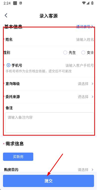 3、在录入客源页面完善基本信息等内容后,点击提交按钮完成客源的录入。