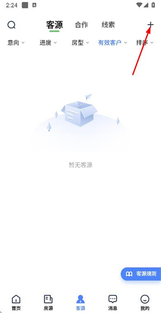 2、在客源页面点击右上角的加号按钮,进入录入客源页面。
