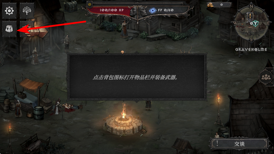 1、根据提示,点击红色箭头指向的背包图标,打开物品栏界面,后续可在此处完成武器的装备操作。
