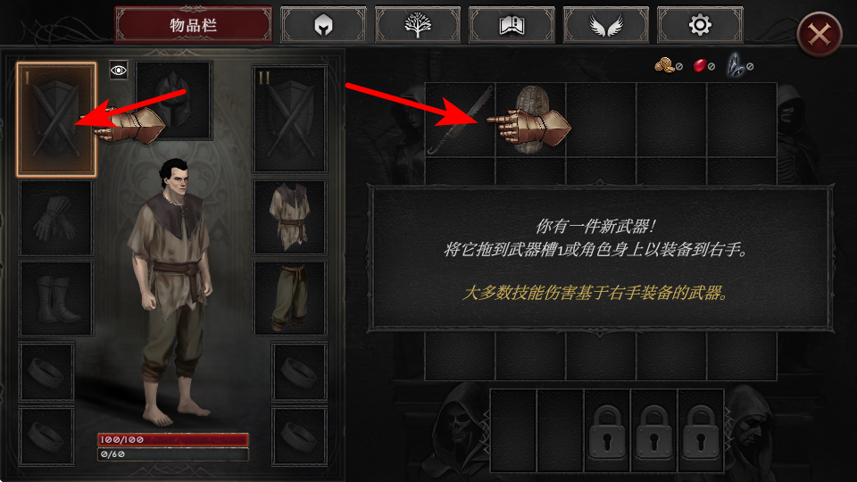 2、在物品栏中,将红色箭头指向的新武器,拖到武器槽或角色身上,即可将其装备到右手,伤害会基于该武器。