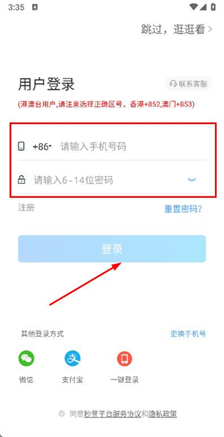 3、在登录页面填写手机号和密码,勾选协议后,点击登录完成账号登录操作。