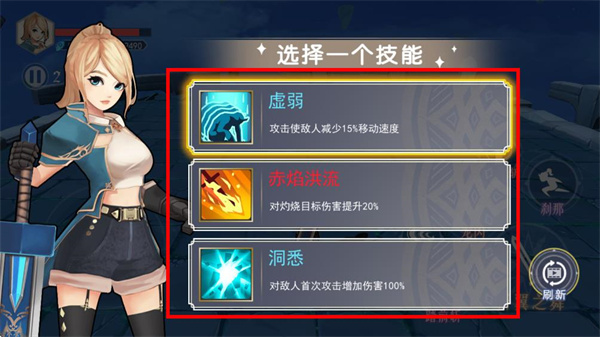 4、击败敌人后触发技能选择界面,从三个技能中选一个,借助技能强化角色战斗能力。