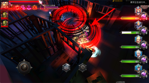 2、战斗中红色箭头指向的区域是技能释放范围,角色会自动对该区域的敌人发起攻击,无需手动瞄准。